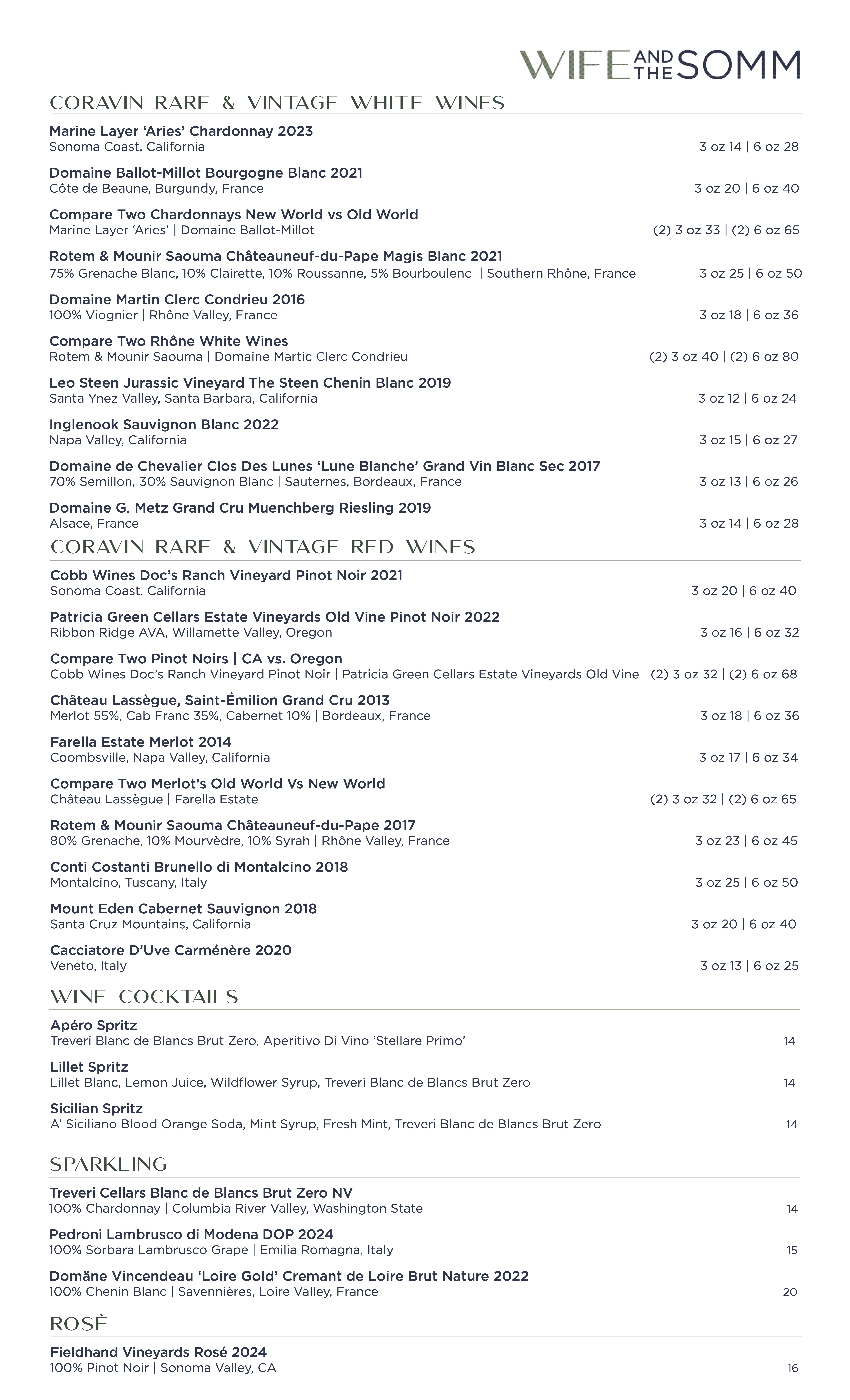 Offering fresh light bites, to a full seasonal dinner, starting in the late afternoon, wife and the somm is the perfect place to relax and unwind in a comfortable, inviting space. With value driven pricing, a strong by the glass program, this husband and wife team has created a menu with a variety of price points.